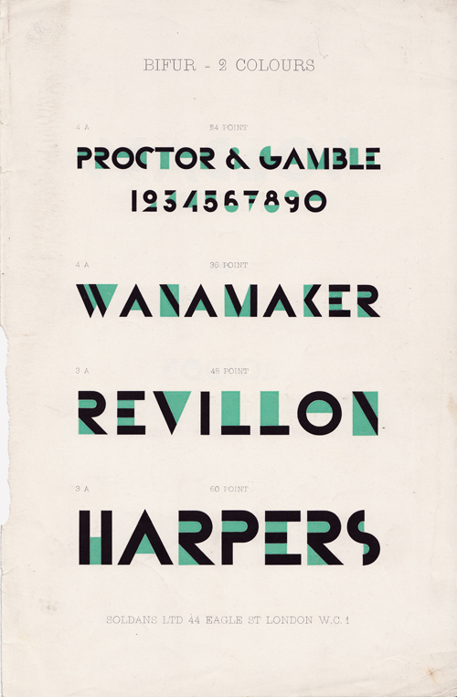 Bifur was commissioned by Charles Peignot, head of the French typefoundry, Deberny et Peignot. This brochure appears to be the UK release / promotion of the typeface by Soldans Ltd (44 Eagle St, London), a type foundry that no longer exists, and which I can find little about.